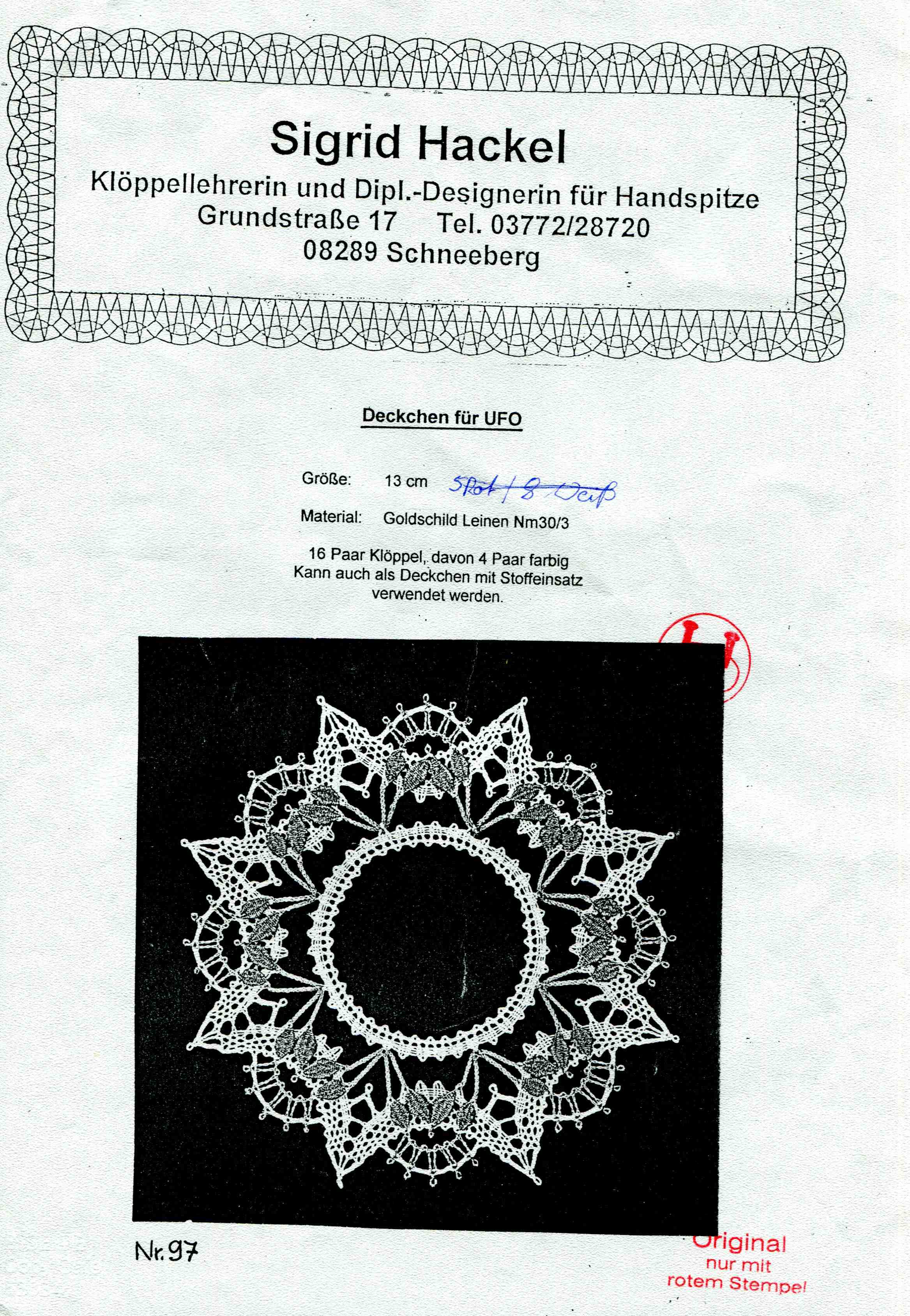 Klöppelbrief Sigrid Hackel Nr. 97 Deckchen für Ufo
